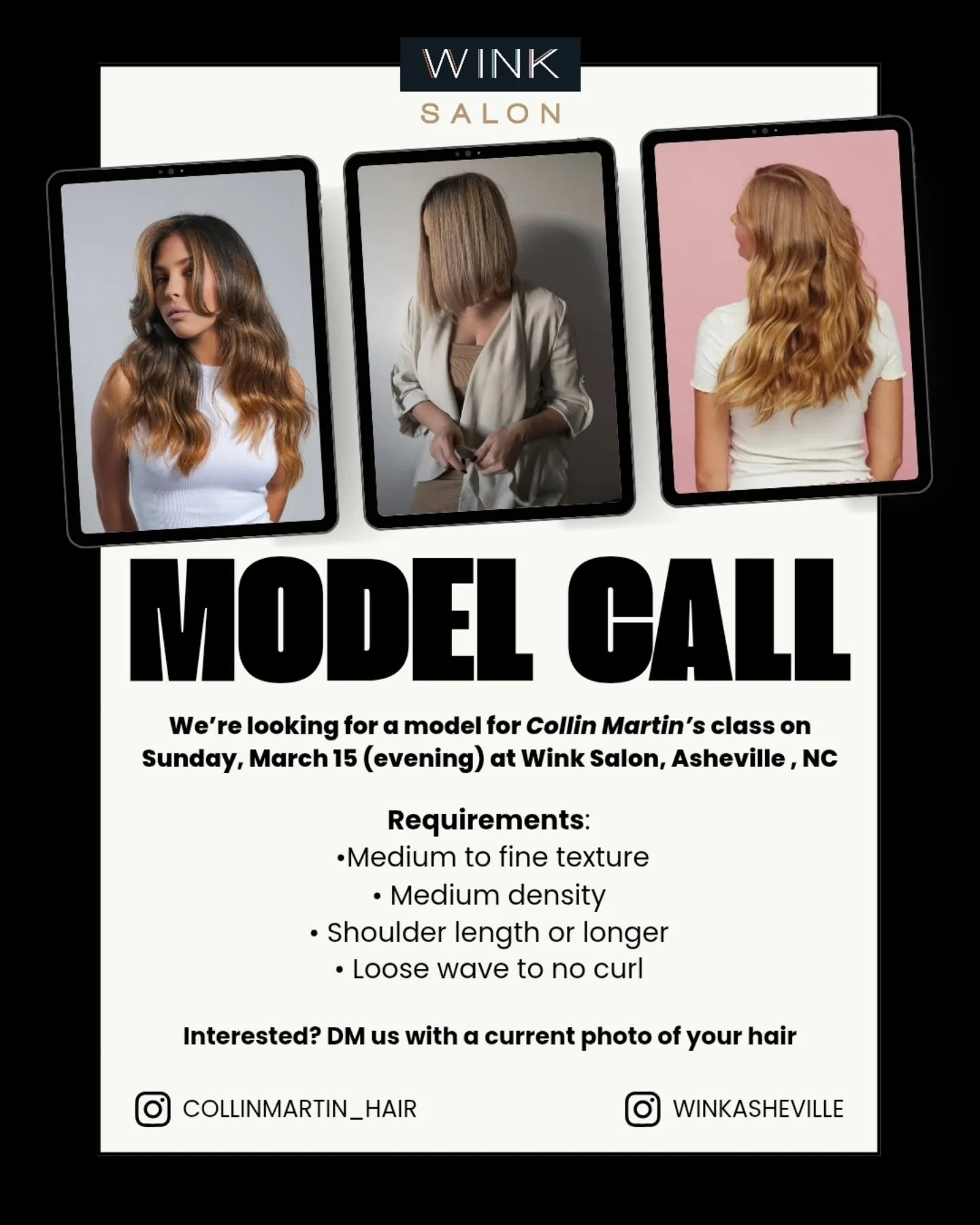 Wink Salon is an education-driven, craft-focused salon thatβs been part of Asheville for more than 22 years. Our stylists grow through Wink University and advanced training, so every service is rooted in skill, intention, and a genuine love for great hair. We work with all hair types, with a special passion for curls, precision cuts, and dimensional color.
